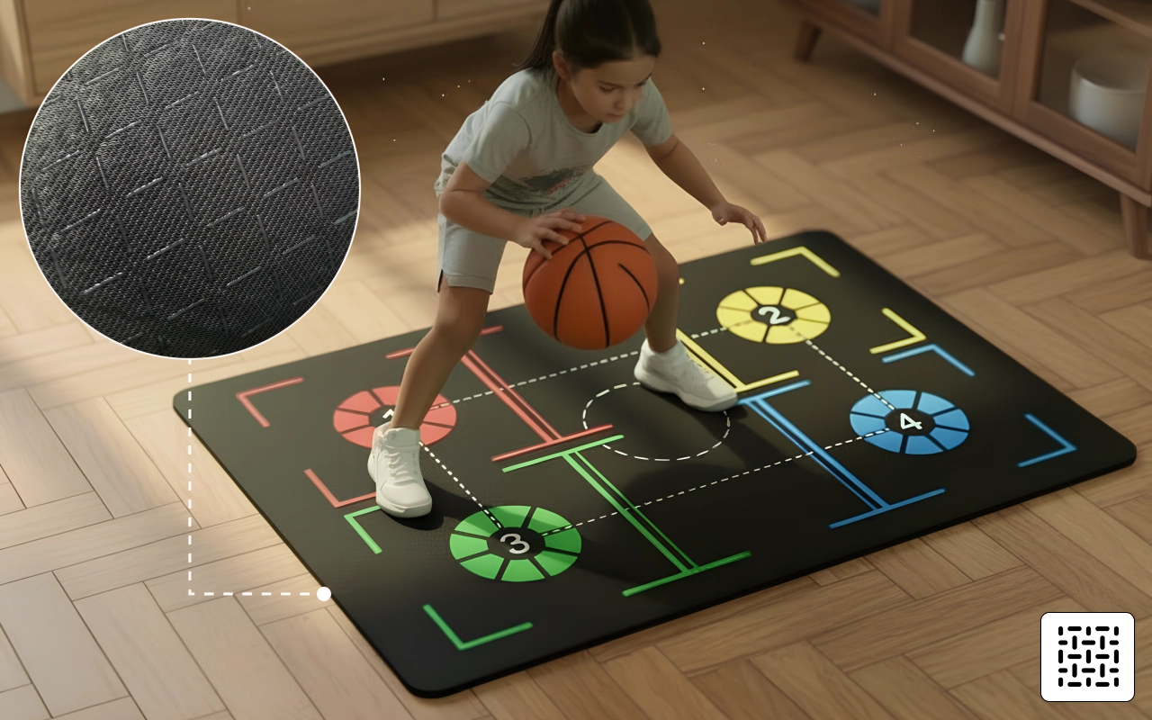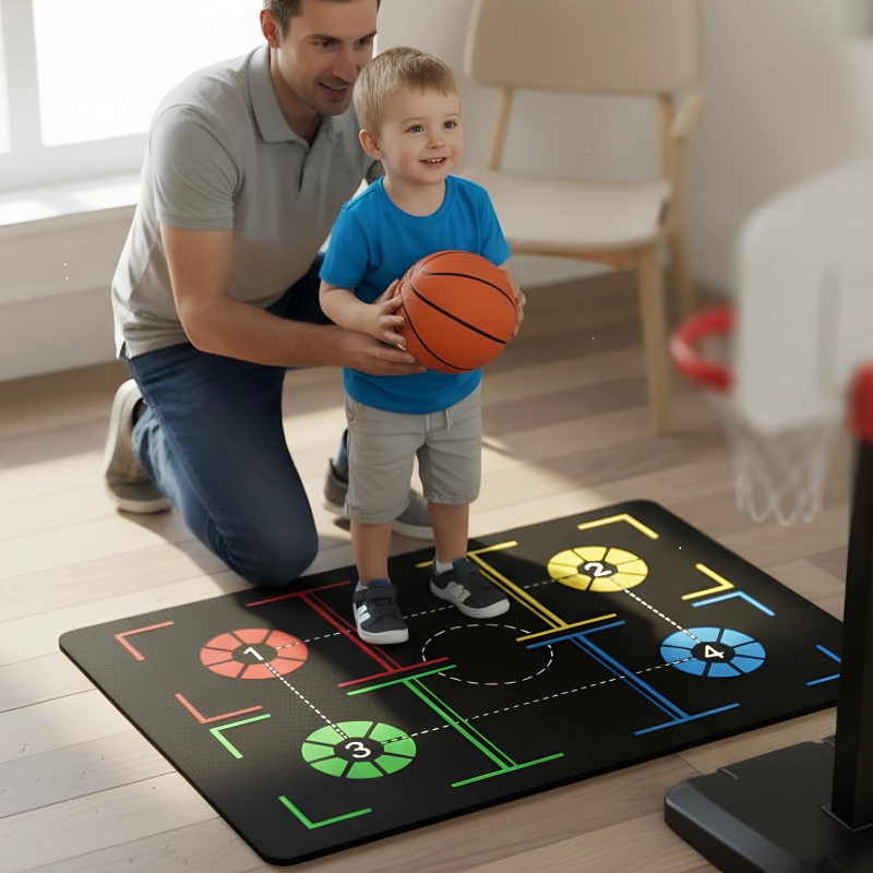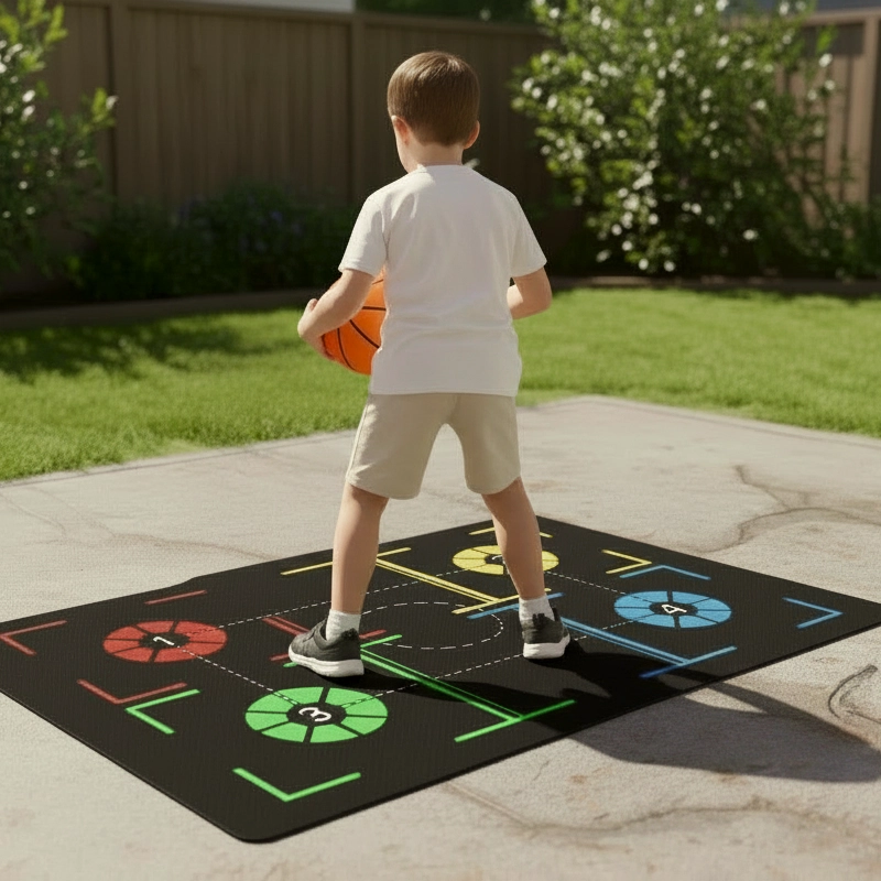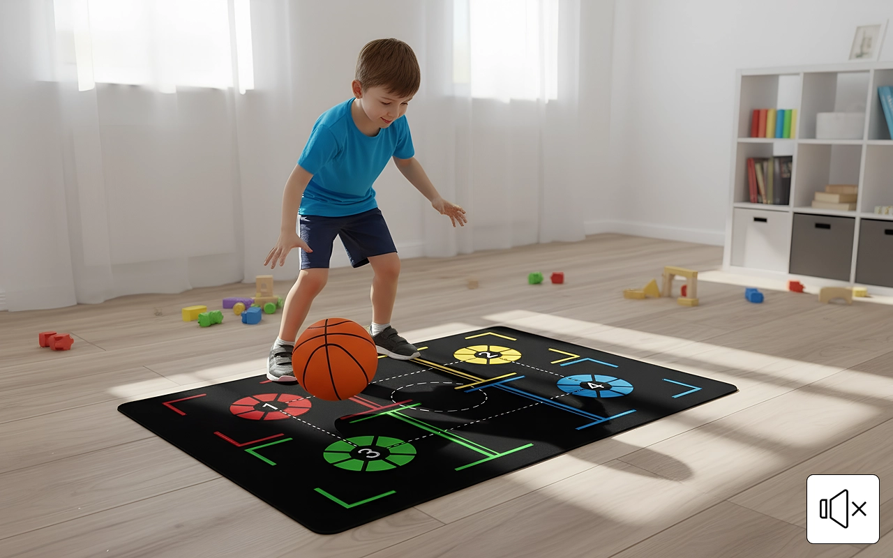 Die Zonen auf der Matte helfen mir zu lernen, wo ich meine Füße hinstellen soll. Ich kann nachts leise dribbeln und wecke meinen kleinen Bruder nicht auf.
