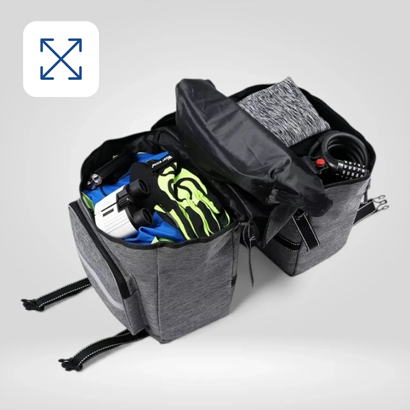 Die Threo-Gepäckträgertasche hält Ihre gesamte Ausrüstung auf jeder Fahrt sicher. Zwei geräumige Fächer helfen, Utensilien zu organisieren und erleichtern das Tragen. Mit den Schnellzugriffstaschen können Sie Werkzeuge oder Snacks ohne Stopp erreichen.