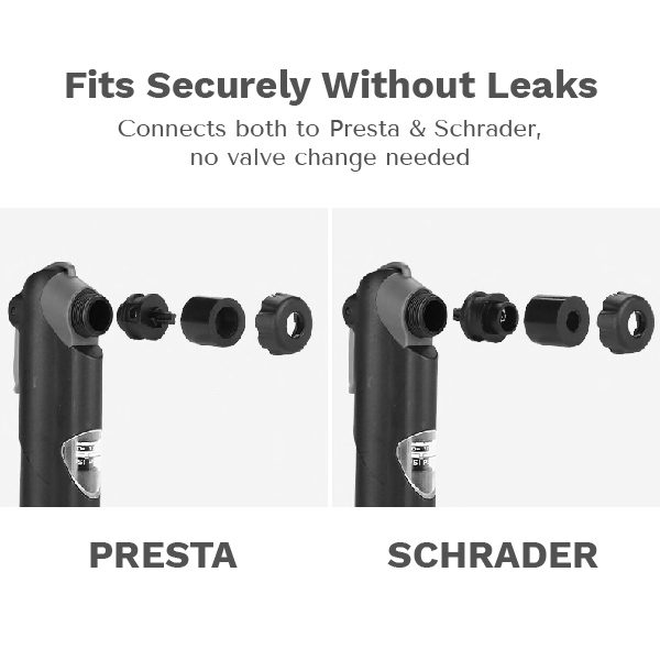 Diese kompakte Pumpe ist so konzipiert, dass sie immer dabei ist – ob in der Tasche oder am Rahmen befestigt. Sie ist sowohl für Presta- (Rennrad und Performance-Bikes) als auch für Schrader-Ventile (Mountainbike-Reifen, Kinderräder) geeignet. Der Wechsel von einem Ventil zum anderen dauert nur ein paar Sekunden und erfordert kein Werkzeug. Die Pumpe wird direkt an das Ventil angeschlossen, ohne dass eine Montage oder ein zusätzlicher Schlauch erforderlich ist. Sie nutzt das großvolumige Design, das sich auf Druck und Zug aufbläst. Die Pumpe ist für einen Druck von bis zu 120psi ausgelegt.