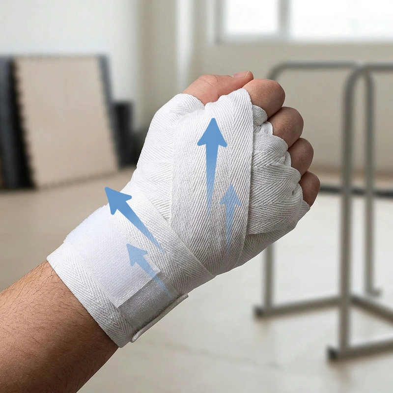 Diese Baumwollbandagen geben mir bei Schattenboxen und Sandsackrunden ein sichereres Gefühl. Die Dehnung ist genau richtig, nicht zu eng, und sie bilden keine Falten unter den Handschuhen.