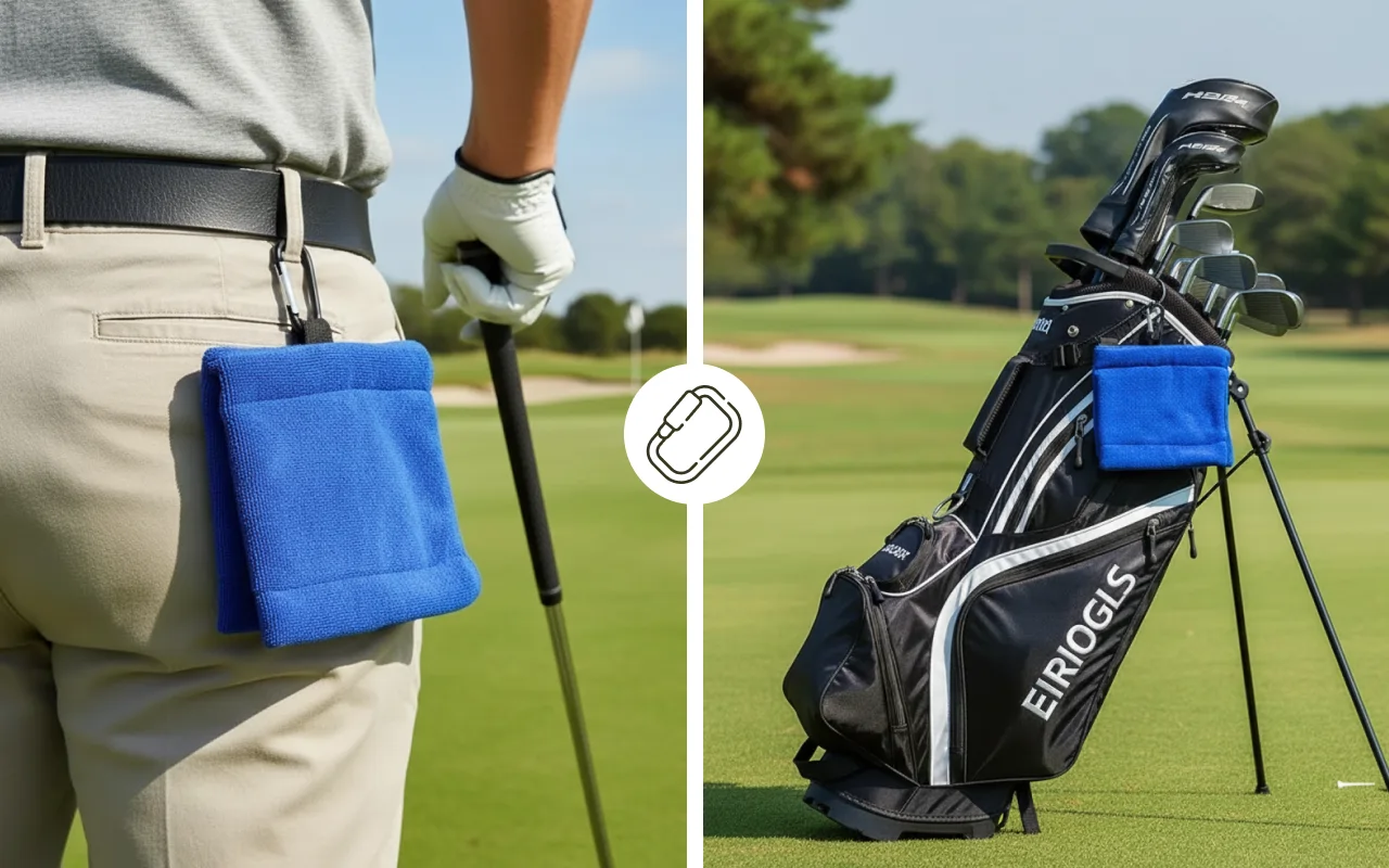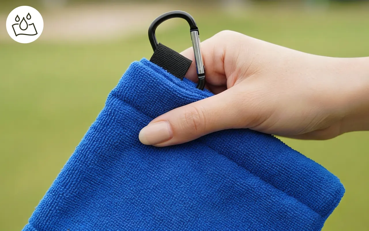 Ein stabiler Haken ermöglicht es dir, das Tuch überall auf dem Golfplatz zu befestigen. Keine sperrigen Extras nötig – einfach greifen und reinigen, wenn es nötig ist.