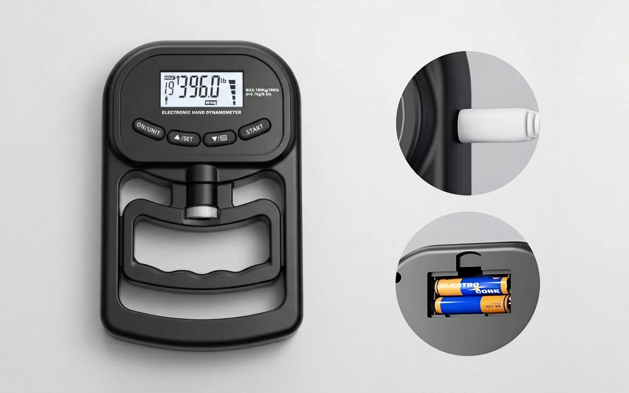 Wählen Sie je nach Bedarf zwischen USB-Aufladung oder herkömmlichen Batterien. Verwenden Sie das Threo-Grip-Dynamometer weiter, ohne sich Sorgen über leere Energiequellen machen zu müssen.