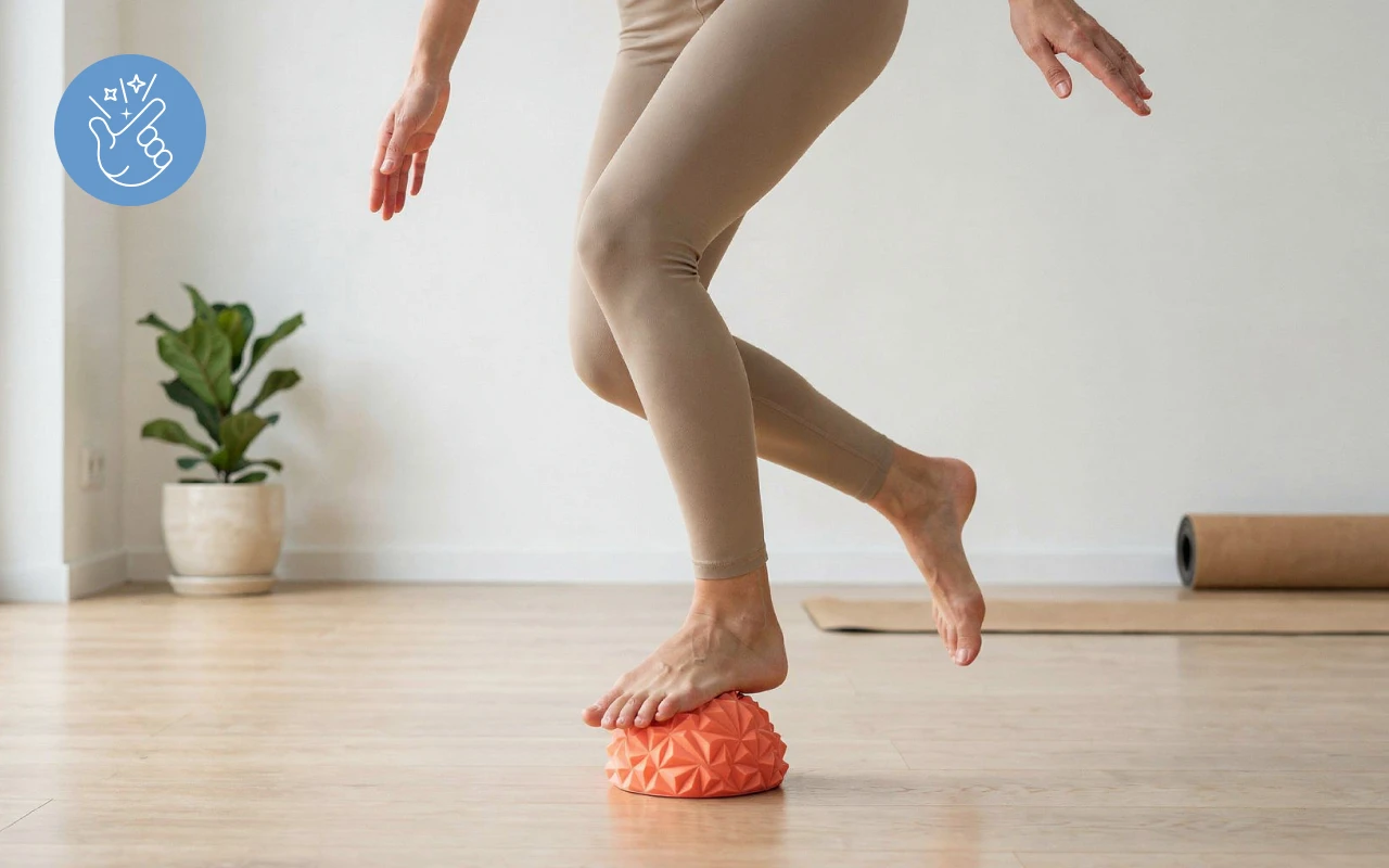 Das Balancieren auf dem Threo-Igelball schärft schnell die Körperkoordination. Bewegung wird sicherer und das Gehen im Alltag fühlt sich stabiler an.
