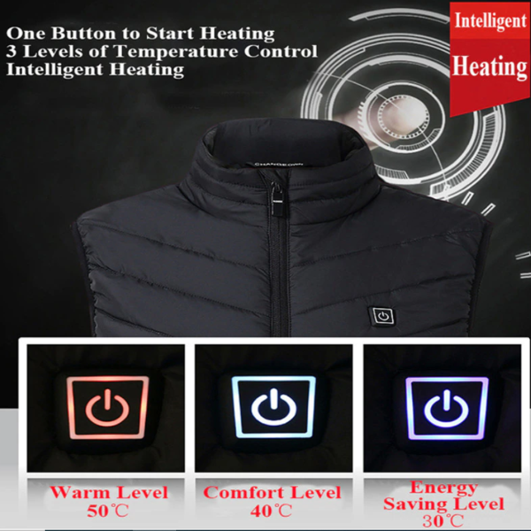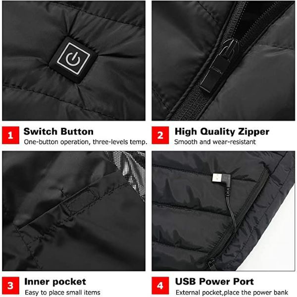 Das Beste daran ist, dass Sie die Heizstufe je nach gewünschtem Wärmebereich und Wärmegrad einstellen können. Es gibt drei Heizstufen: 30 ℃-niedrig, 40 ℃-mittel und 50 ℃-hoch. Die THREO Heizweste ist aus hochwertigem, antistatischem und leichtem Stoff gefertigt. Sie ist wärmespeichernd und hat eine gute Wärmeleistung. Das Reißverschlussdesign und die Reißverschlusstaschen machen die Weste angenehmer zu tragen. Diese unisex USB-Wärmeweste verleiht einen Hauch von Stil.