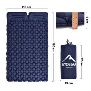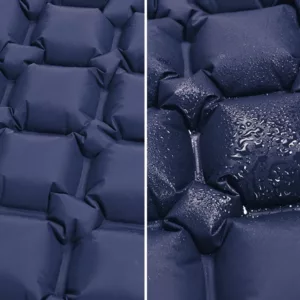 Unsere Threo-Luftmatratze hat eine robuste Konstruktion und eine dunkle marineblaue Farbe, die sie widerstandsfähig gegen Abnutzung, Risse und Flecken macht.