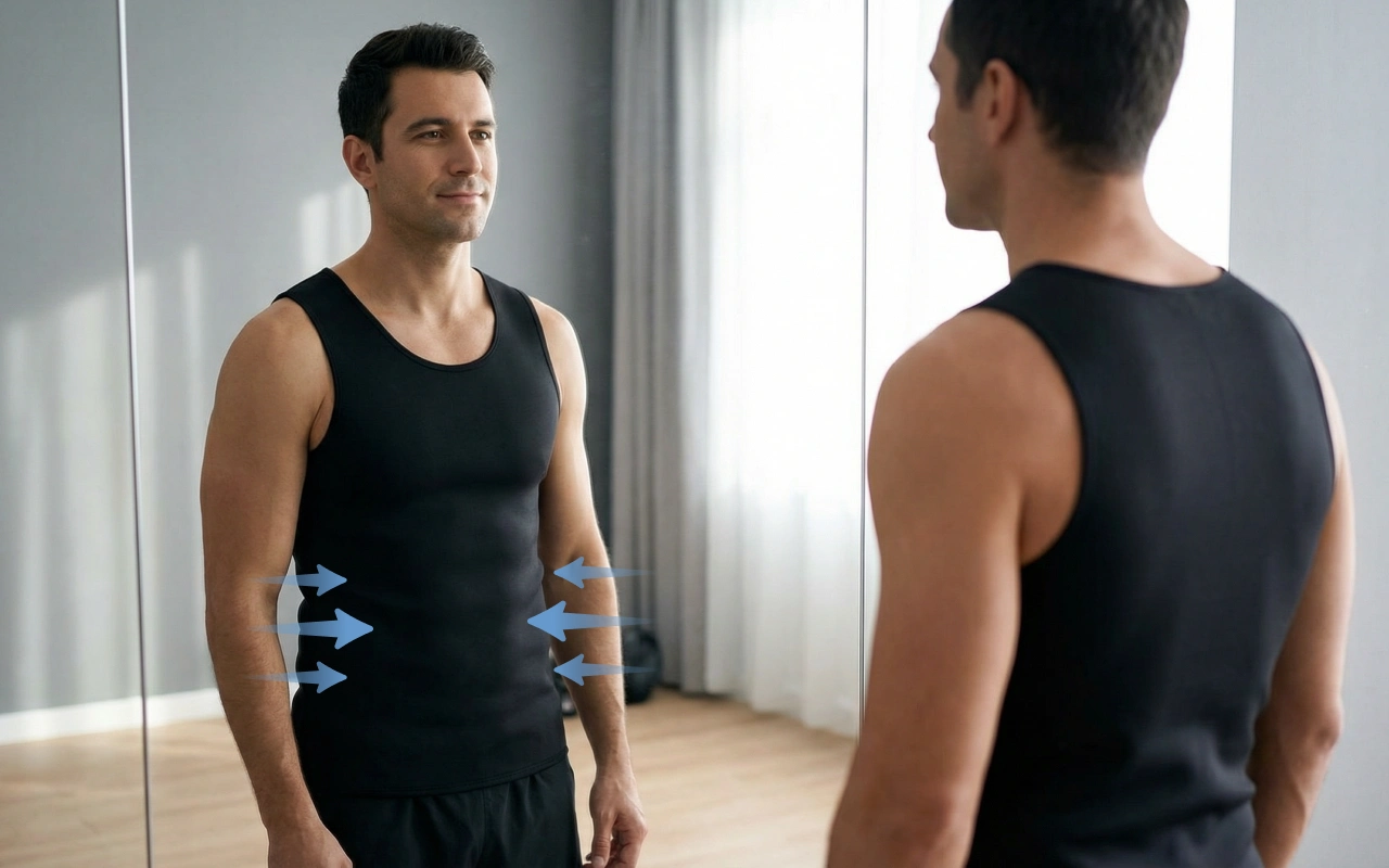 Ich habe es für meine Abendspaziergänge gekauft. Es umschließt meinen Oberkörper, ohne einzuengen, steigert das Schwitzen schnell, und die Bauchkontur unter T-Shirts ist deutlich sauberer.