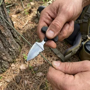 Ich bewahre dieses Outdoormesser in meinem Truck für Wanderungen mit meinem Mann auf. Es lässt sich schnell ziehen, schneidet Paracord sauber, und der Griff rutscht nie, selbst mit verschwitzten Händen.