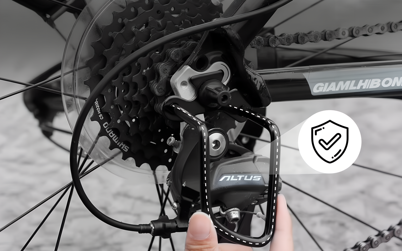Unser Schaltwerkschutz sorgt dafür, dass es keine Beeinträchtigung von Pedalen oder Rädern gibt. Er bleibt dezent und bietet dennoch vollständigen Schutz.