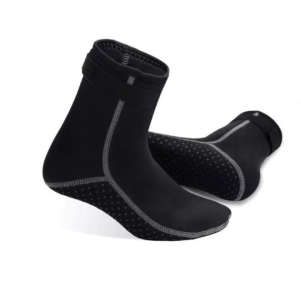 Die elastischen Knöchelriemen lassen sich auf jede Knöchelgröße einstellen. Die Socken sind so bequem, dass sie den ganzen Tag tragbar sind. Die Neoprensocken sind aus robusten Materialen hergestellt, die zur Gewährleistung einer hohen Festigkeit und langen Haltbarkeit geklebt und mit Blindnähten versehen sind. Die Socken sind atmungsaktiv und schnell trocknend und die Sohle ist mit Anti-Rutsch-Noppen versehen. Diese Socken halten Ihre Füße warm, selbst in eiskaltem Wasser. Elastische Knöchelriemen erleichtern das Anziehen und verhindern ein Eindringen von Sand.